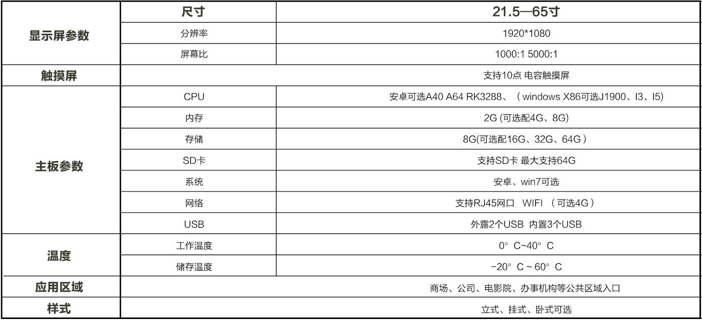 超薄機身;質(zhì)感拉絲金屬;高清畫質(zhì);觸摸極速反應(yīng);智能分屏;智能遠程信息發(fā)布;可定時開關(guān)機;提前設(shè)定節(jié)目源;鋼化玻璃屏幕;可定制專屬LOGO、多種顏色、尺寸可選。